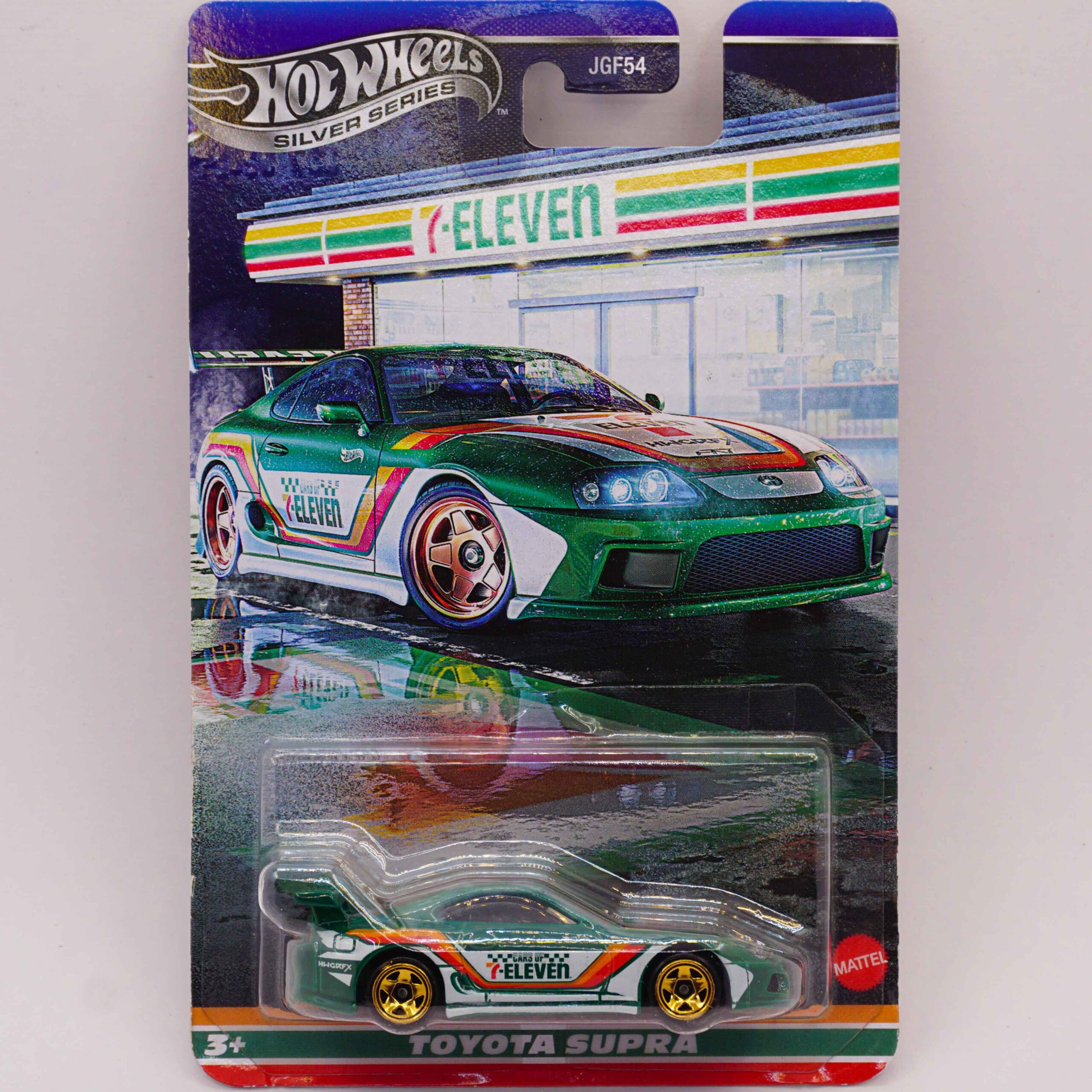 Toyota Supra Hot Wheels Silver Series features a clean metallic finish paired with the iconic 7-Eleven livery, making this a standout piece in the Silver Series lineup. The Supra, especially in its Mk4 era, remains one of the most celebrated JDM performance cars thanks to its 2JZ-GTE engine, tunability, and legendary motorsport and street-racing presence.